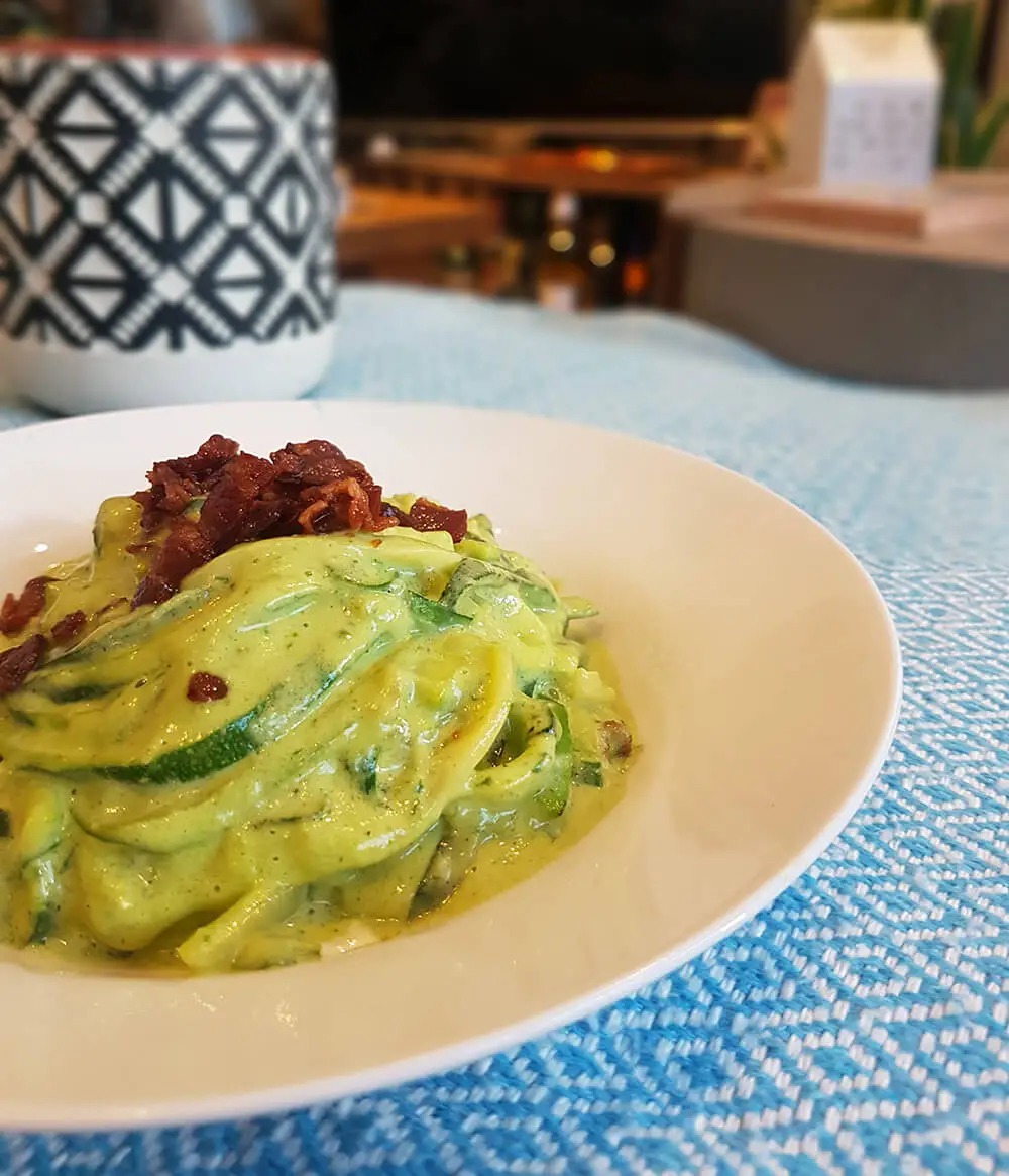 I love this recipe because it’s delicious and nourishing. Parmesan, garlic, and bacon will have your taste buds doing backs flips. Plus, avocado, spinach, and zucchini will supply your body with precious vitamins and minerals. Everything is ready in less than 15 minutes and you’ll feel like a celebrity chef with all the compliments you’ll receive from family and friends.